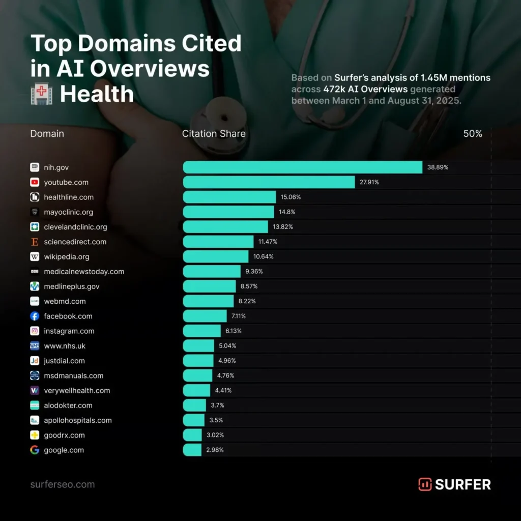 In the healthcare sector, YouTube accounts for roughly 28% of AI citations when the query requires an “approachable” or “patient-friendly” explanation.